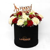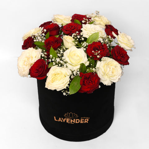 Birthday Box features a sophisticated blend of red and white flowers, expertly arranged to create a striking contrast symbolizing love and purity.