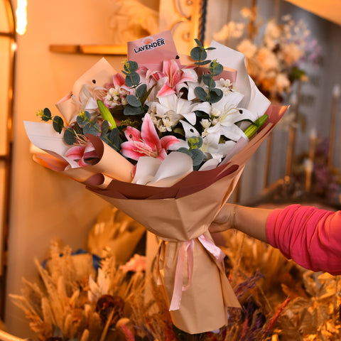 Bloom & Smile combines the classic elegance of lilies with the timeless beauty of roses, creating a harmonious floral arrangement that conveys grace and warmth.