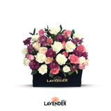 Natural flower box of multi coloured roses in rectangle black velvet box.