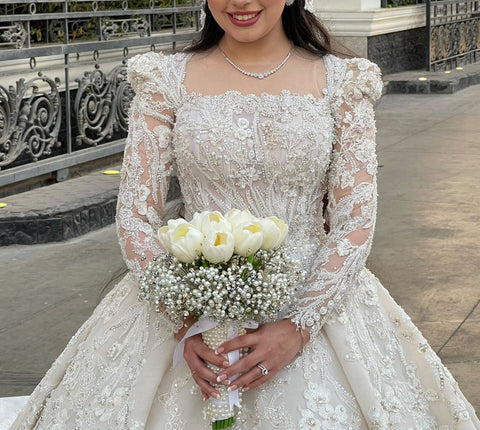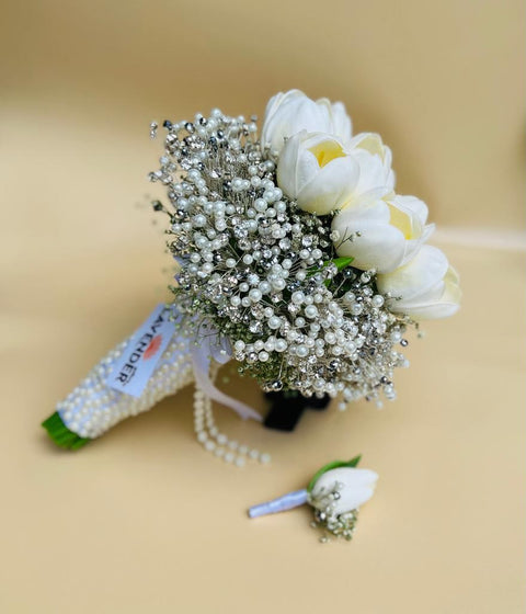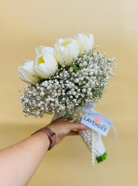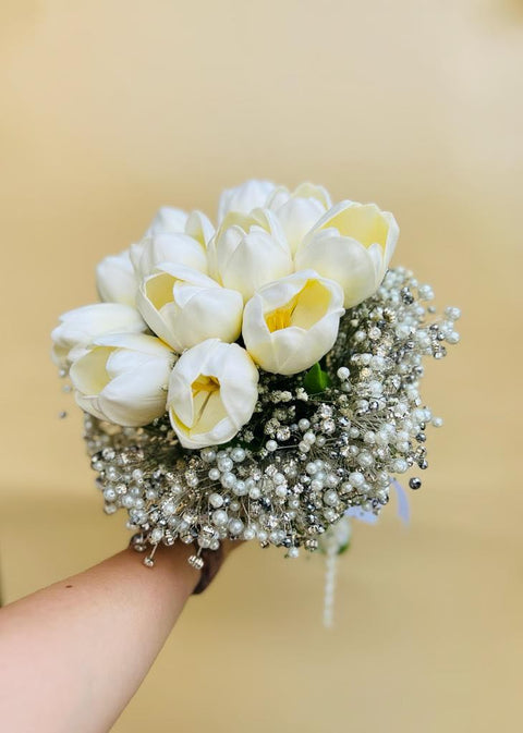 Elevate your bridal look with the Handmade Bridal Jerb, featuring a carefully arranged tulip bouquet crafted by skilled artisans.